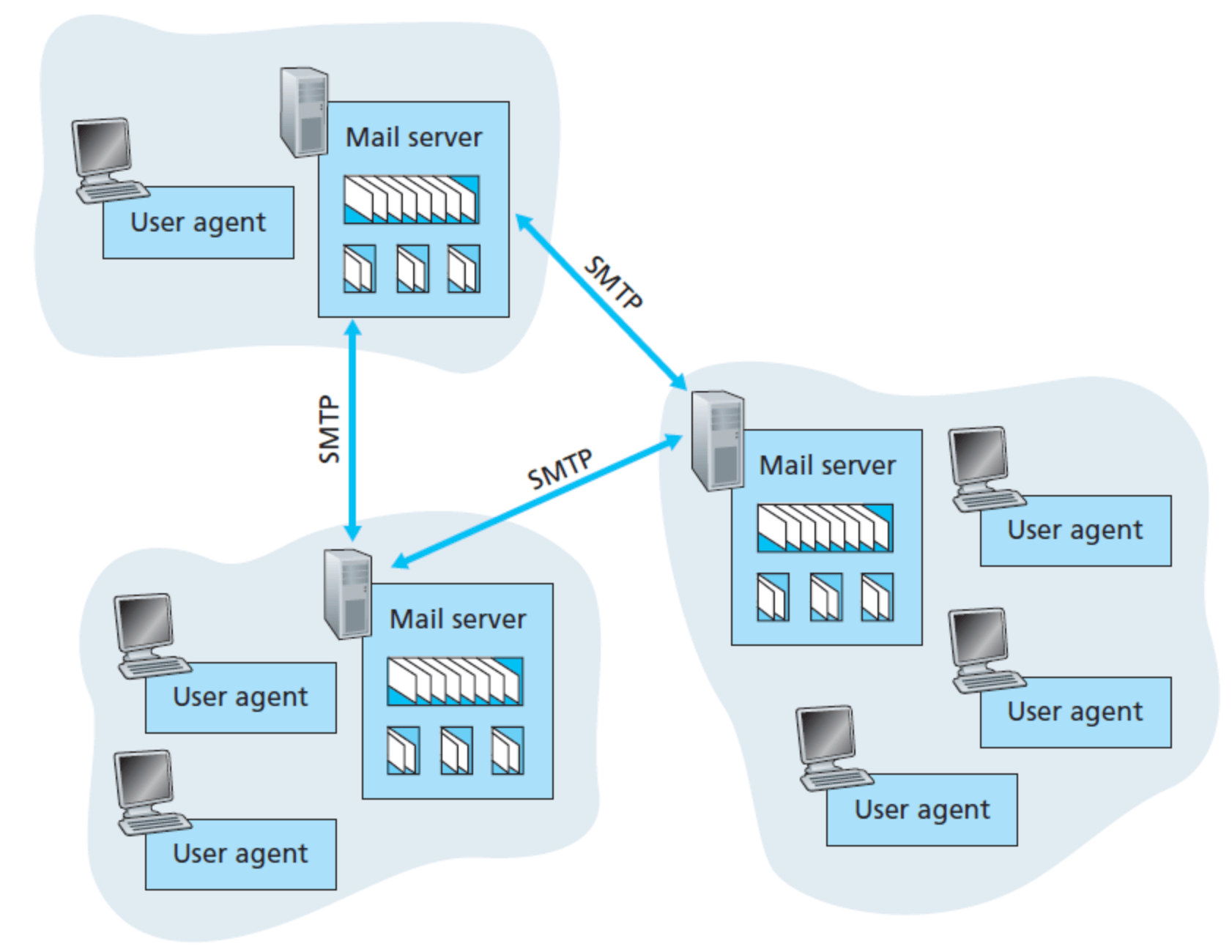 메일을 작성해서 내 메일 서버에 전달하면, 메일 서버 안의 outgoing message queue에 저장한다. 이후 SMTP를 통해 다른 메일 서버로 전송하고, 수신자의 메일박스에 메일을 넣어준다. 이후 수신자는 자신의 메일서버에 접속해서 메일을 읽어낸다.