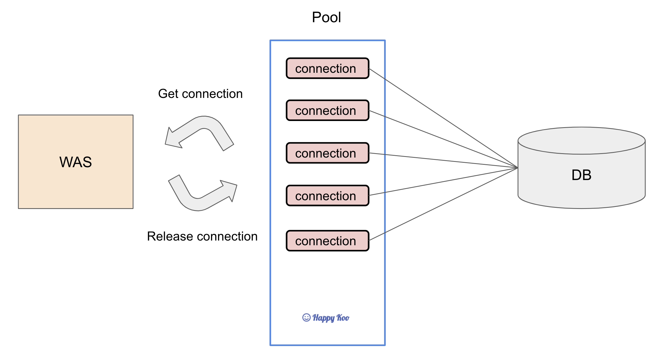 - 미리 커넥션의 개수를 확보해 둔 뒤 이 커넥션을 애플리케이션에서 사용하고 반환하는 형태